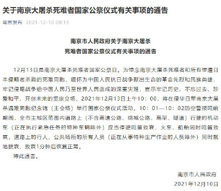 据@南京发布 ,2021年12月13日上午10:00,将在侵华日军南京大屠杀遇难同胞纪念馆(主会场)举行国家公祭仪式活动。10:01—10:02防空警报鸣响期间,南京全市主城区范围内道路上(不含高速公路、绕城公路、高架、隧道)行驶的机动车(正在执行紧急任务的特种车辆除外)应当停驶鸣笛致哀,火车、船舶同时鸣笛致哀,道路上的行人、公共场所的所有人员(正在从事特种生产作业的人员除外)同时就地默哀,致哀1分钟后恢复正常。