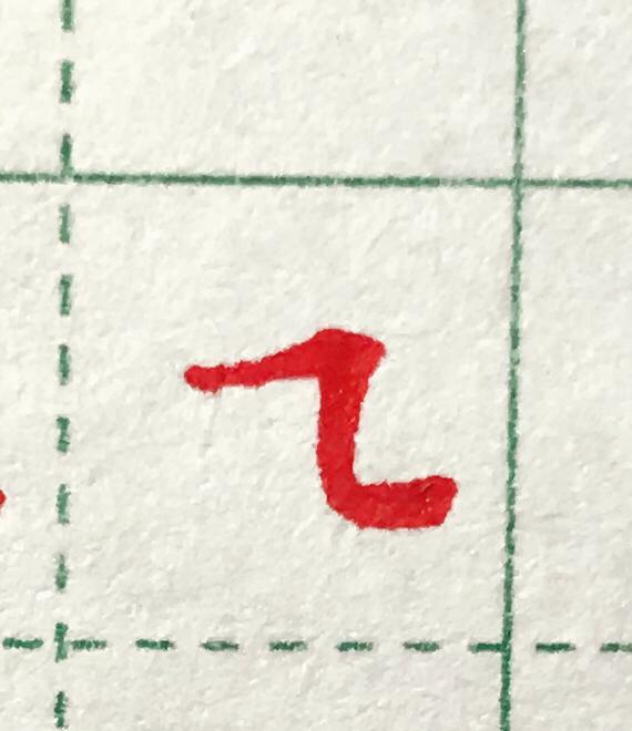 横起笔轻,逐渐加重,右上抬头后顿笔,然后回笔出肩膀,上面一横较右上斜,垂直折下来,下面的弯较平,收笔部分要圆,不可太尖或太过菱角,如图所示