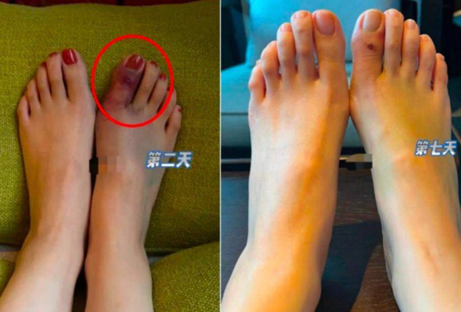 刚受伤的时候,佟晨洁的脚受伤的地方和没受伤的地方的颜色形成了鲜明的对比,颜色十分瘆人,而这样的疼痛佟晨洁整整忍了7天才有所好转,其实本来是可以更早一些恢复的,但是因为她还有很多工作要进行,有许多都是需要穿高跟鞋走路,这无疑加深了病情,但也是无奈之举。
