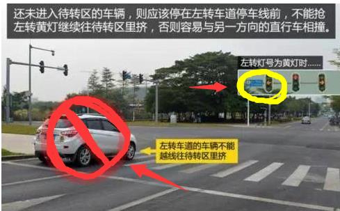 提示:尽管进入了待转区,也一定注意最基本的,不能压线跟越线。