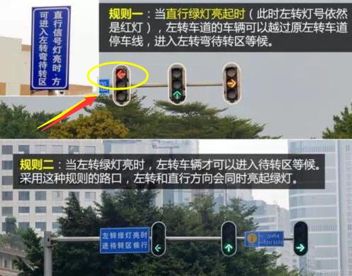 1:如果直行绿灯亮此时左转灯依然处于红灯状态时,此时可进入左待转区。(如图下的规则1)