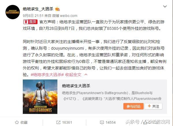 《绝地求生:大逃杀》官博昨日发布声明,称对近日大家关注的主播糯米开挂一事,行了反复细致的比对和检测,确认账号:douyumoyinnuomi,有多次使用外挂的记录,因此对该账号进行了永久封禁的处理。