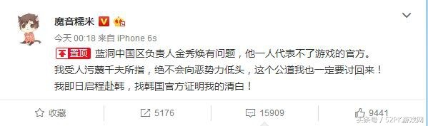 他在博文中写道:“蓝洞中国区负责人金秀焕有问题,他一人代表不了游戏的官方。我受人污蔑千夫所指,绝不会向恶势力低头,这个公道我也一定要讨回来!我即日启程赴韩,找韩国官方证明我的清白!”