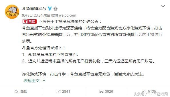 而后原本力挺糯米的斗鱼也发布了处罚公告,表示会永封魔音糯米的斗鱼直播间,同时追究并返还糯米直播的所有用户打赏礼物,三天内退还回所有用户账号。