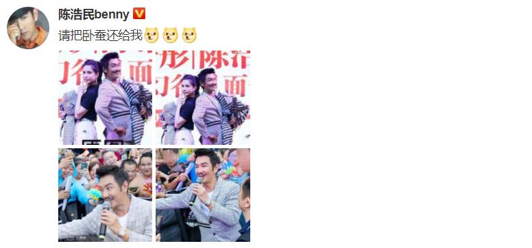 然而,就在大多数网友都将活动照当做陈浩民当下的现状时,有粉丝质疑起了图片的真实性,称照片中的形象与现实中看到的有些不符,但又难以说出其中的蹊跷。7月19号,陈浩民在社交平台上幽默地表示:“请把卧蚕还给我”,并晒出了两组对比照。
