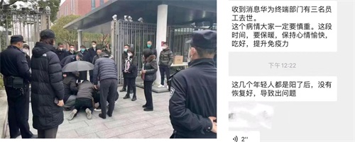从照片来看,家属举着遗像站在华为行研的西门口,安保人员在周围随时待命。还有人声称华为终端部分(CBG)有三名员工去世,但是并没有直接证据。