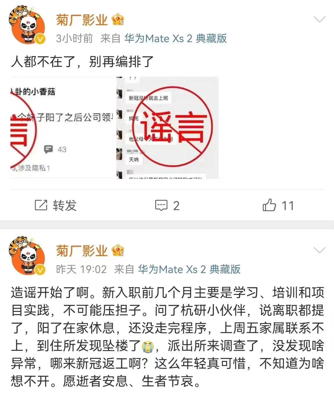 但随后就有名为“菊厂影业”的大V辟谣称,该员工提了离职,阳了之后在家休息,还没走完离职流程。在上周五(12.23)家属联系不上,到住所后才发现坠楼了。