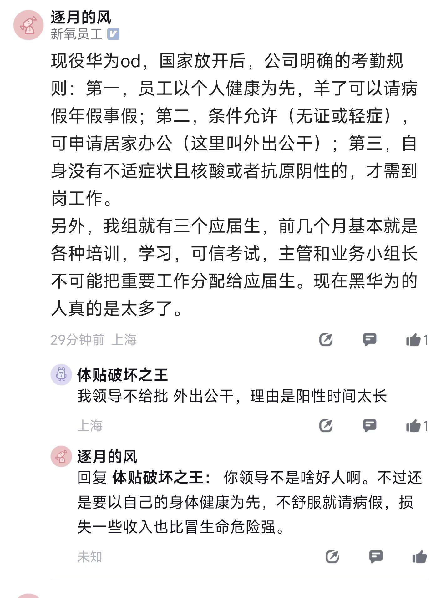 从整个流程来看,笔者更倾向于辟谣的发言,毕竟家属拿着遗像肯定是维权发生的事情,不可能员工一猝死家属就能立即跟进。华为的员工也在评论区现身说法,声称公司明确规定了考勤规则:(1)员工以个人健康为先,阳了可以请病假年假事假;(2)如果条件允许 (无症或轻症)可申请居家办公 (这里叫外出公干) ;(3)自身没有不适症状且核酸/抗原阴性的,才需到岗工作。华为应届生入职前期并没有多大的工作量,普遍处于适应阶段,所以不会出现要求员工阳性还来加班的情况。