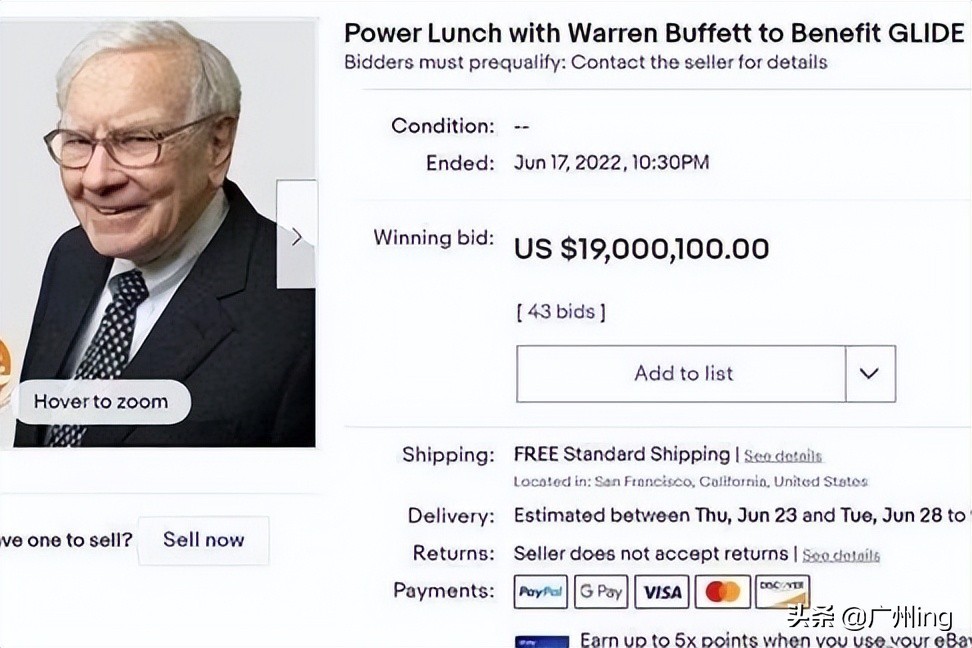 6月13日,在受疫情影响被迫中断两年后,2022年的巴菲特午餐在eBay开拍,起拍价为2.5万美元(约16.85万元人民币)。