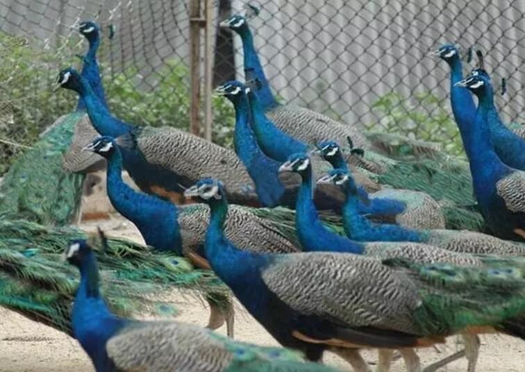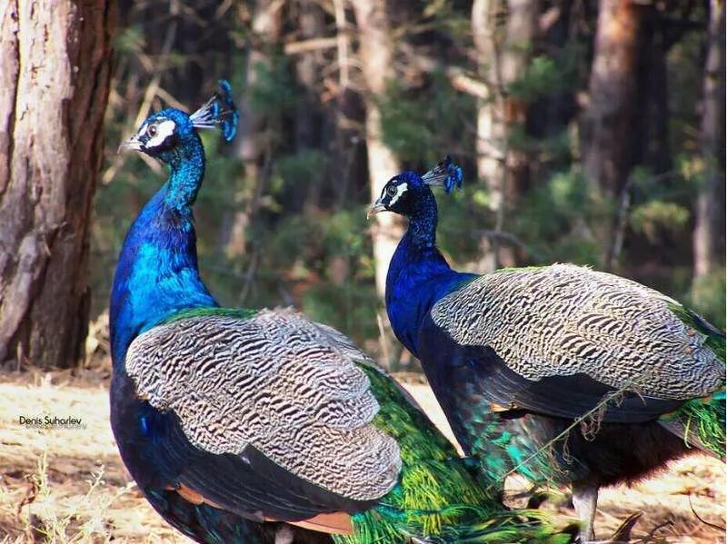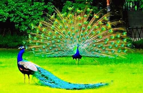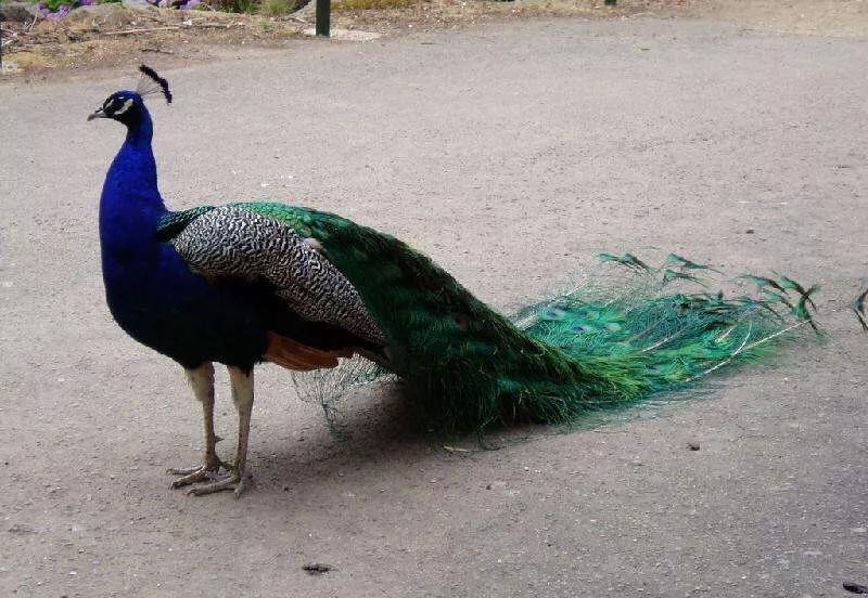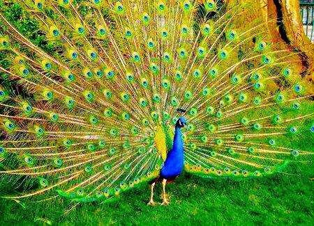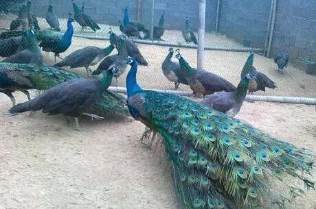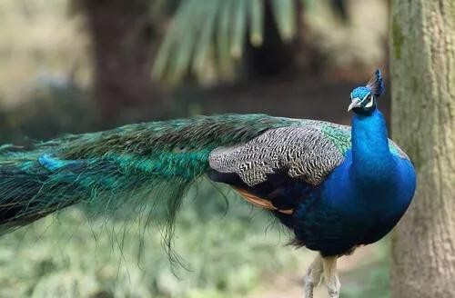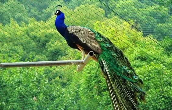 蓝孔雀又名印度孔雀,体长90-230厘米,翼长130-160厘米,体重4-6千克。雄鸟具有直立的枕冠,羽色华丽,颈部为宝蓝色,尾屏绿色,富有金属光泽。印度国鸟,伊朗两国鸟之一。