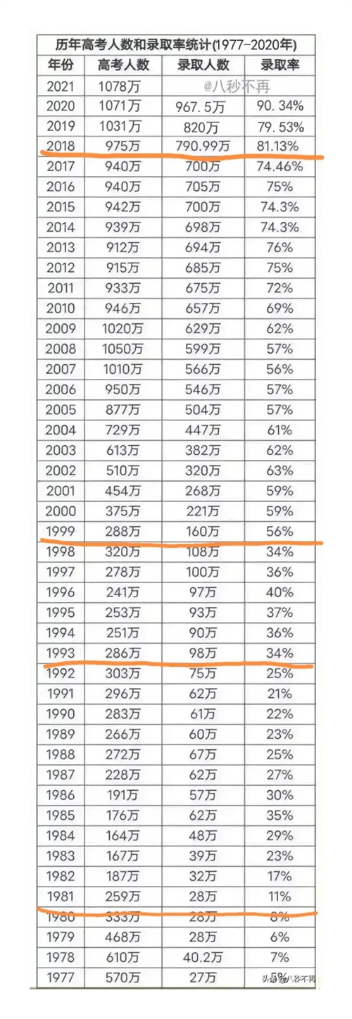 看到这张历年高考录取率的图,想起自己高考那一年正好赶上扩招,就是1999年,录取率一下由百分之三十多提高到百分之五十多。也正是因为扩招,自己才有幸上大学,毕业后能有个稳定的工作,否则还是农民得四处打工吧,真的感谢那一年的好政策呀!人生际遇如何,首先得看国家大势就是这个意思吧!