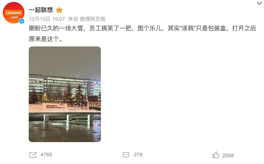 12月13日,针对联想总部LOGO涂鸦事件,认证为“联想集团中国区市场部”的官方回应:“期盼已久的一场大雪,员工搞笑了一把,图个乐儿,其实‘涂鸦’只是包装盒,打开之后原来是这个。 ”而针对网传截图回应“严惩”一事,有内部员工则予以否认,称原截图来源为内部论坛员工讨论板块,非公司官方账号,系乌龙。